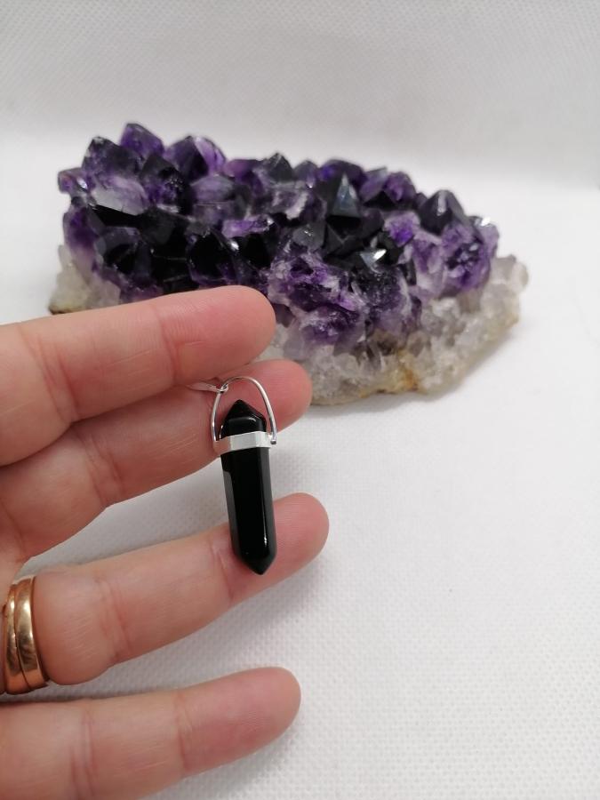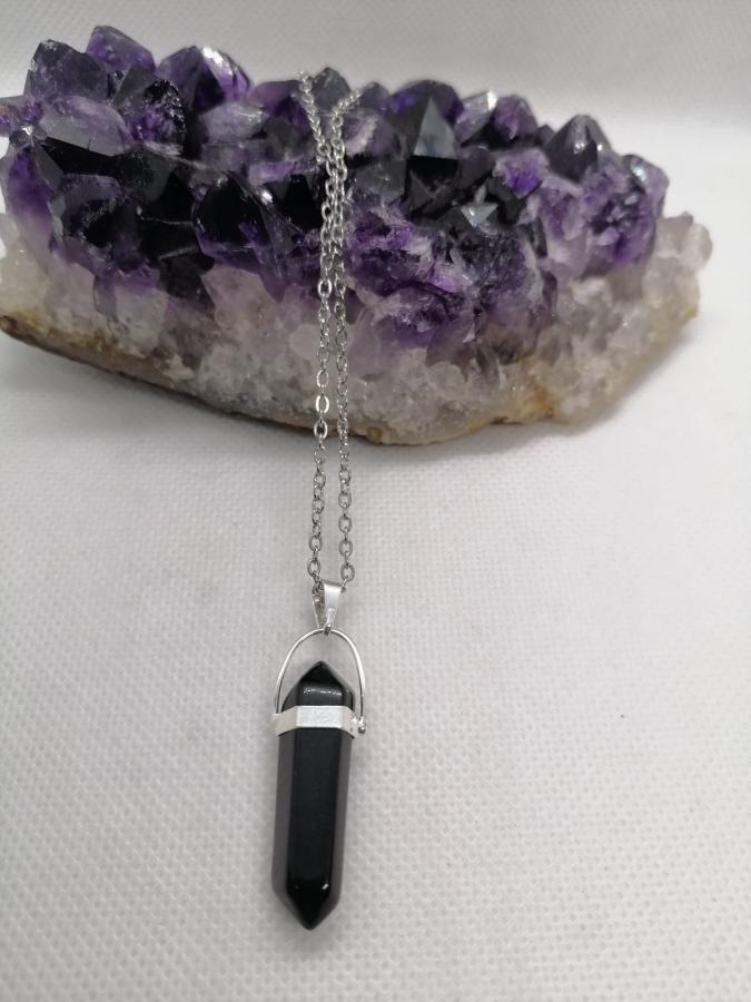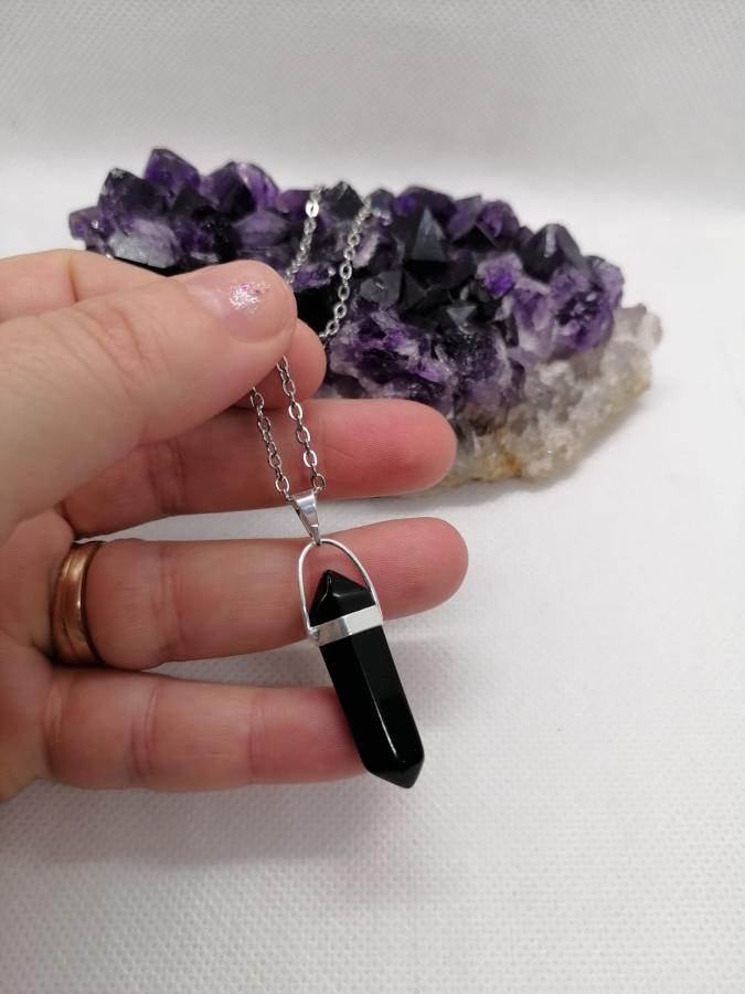 Dije hexágono en piedra natural obsidiana con cadena fina de acero.
