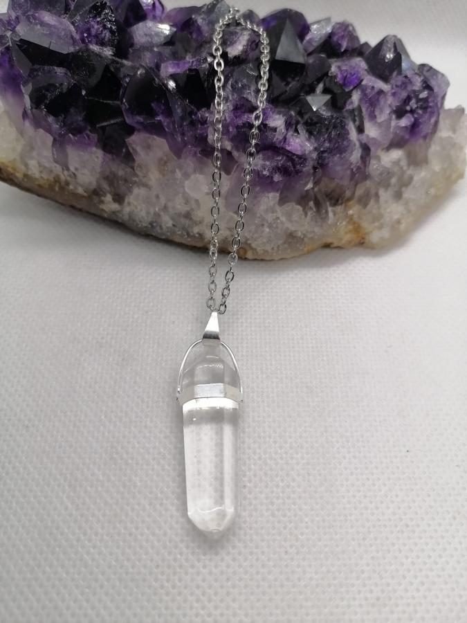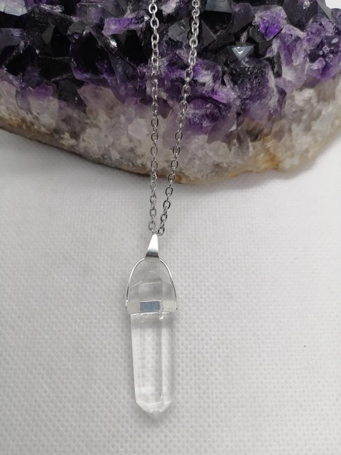 Dije hexágono en piedra natural cuarzo cristal con cadena gruesa de acero.