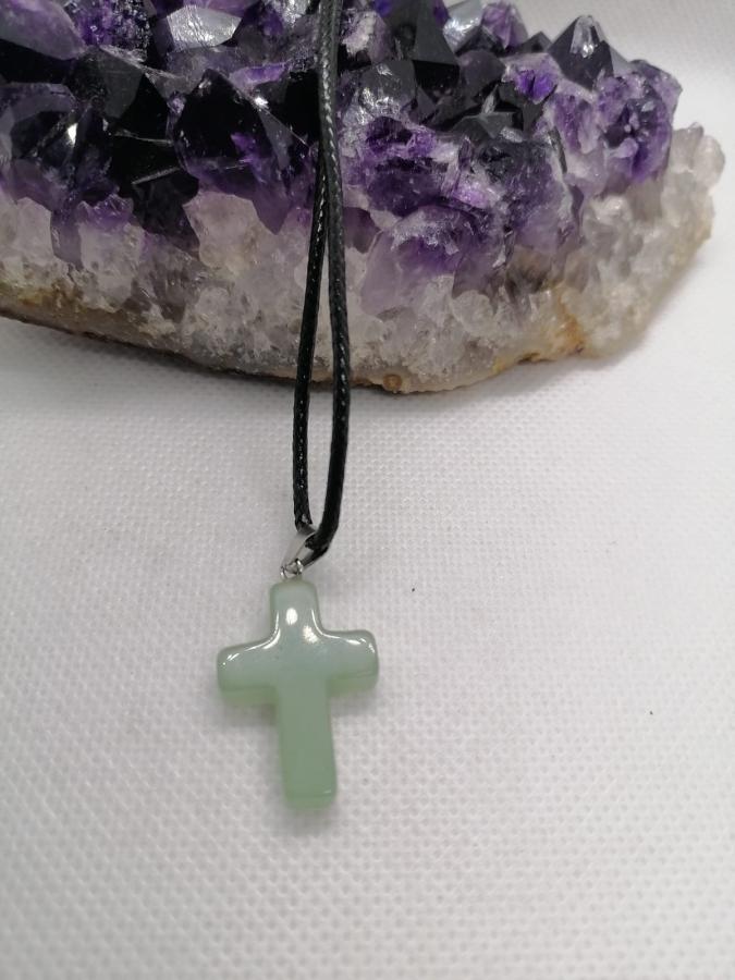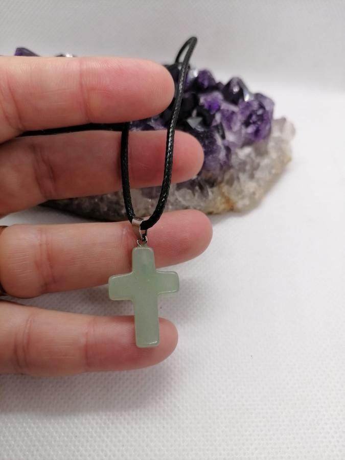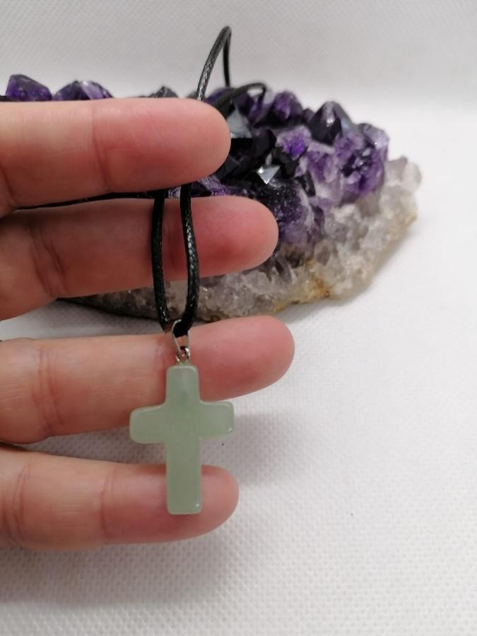 Dije en forma de cruz en piedra natural cuarzo verde con cordón negro.