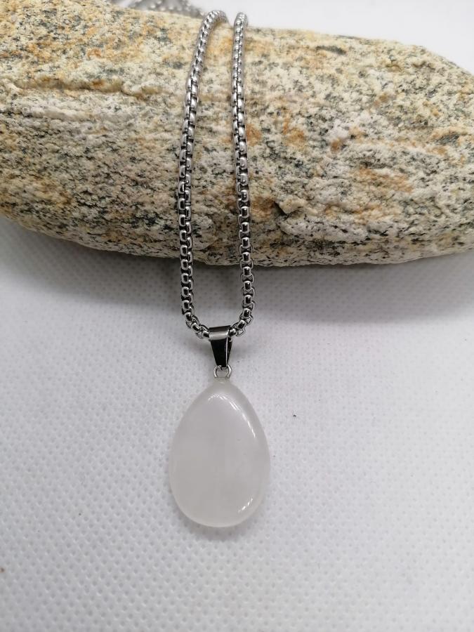 Dije gota en cuarzo blanco en piedra natural con cadena gruesa de acero.