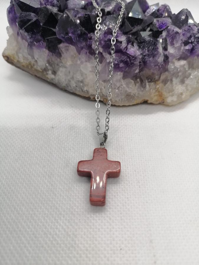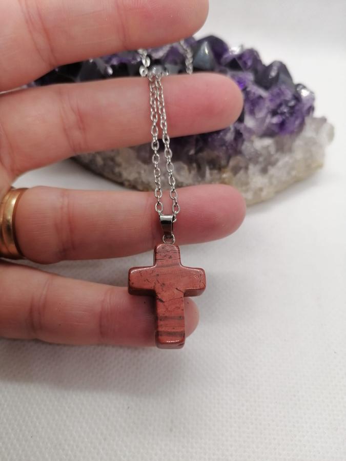 Dije cruz en piedra natural jaspe rojo con cadena fina de acero.