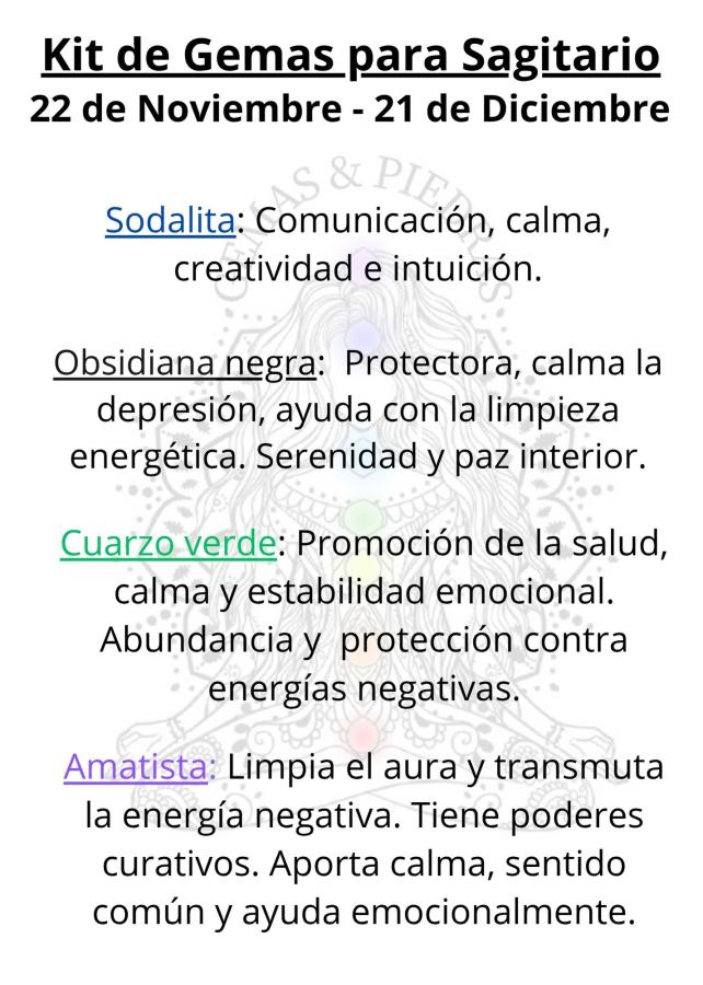 El set incluye: cuarzo verde, sodalita, amatista y obsidiana negra.
