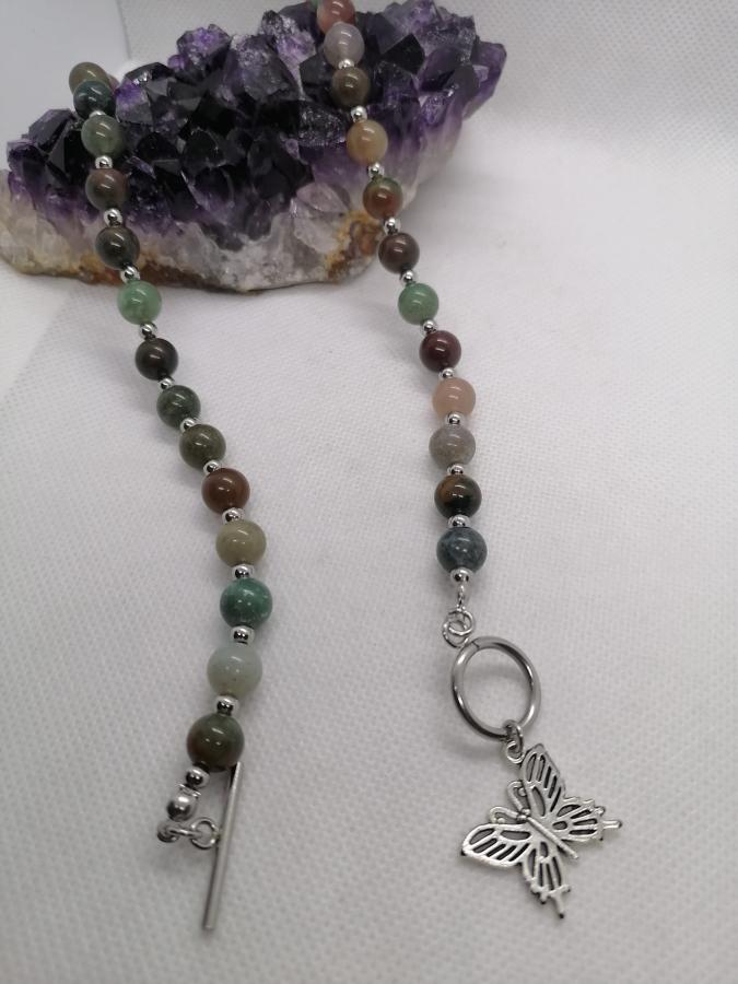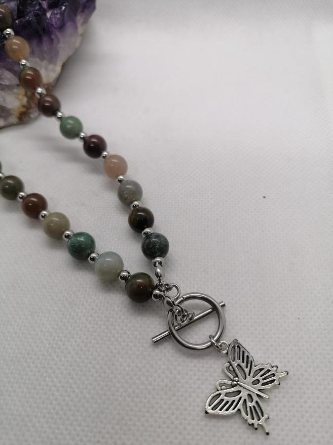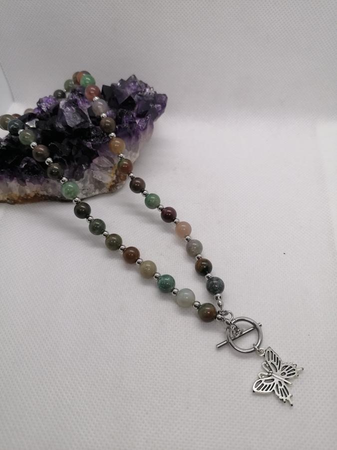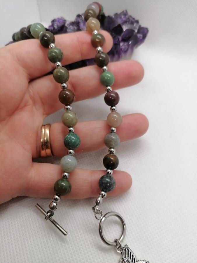 Collar o gargantilla en ágata india en bolita de 8mm con separadores y cierre de acero.