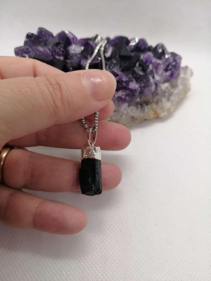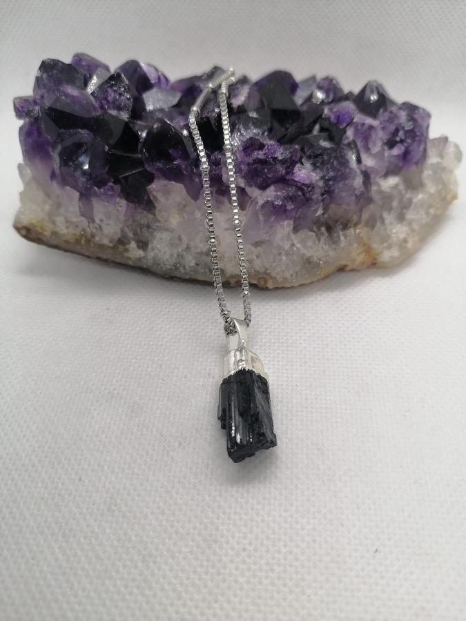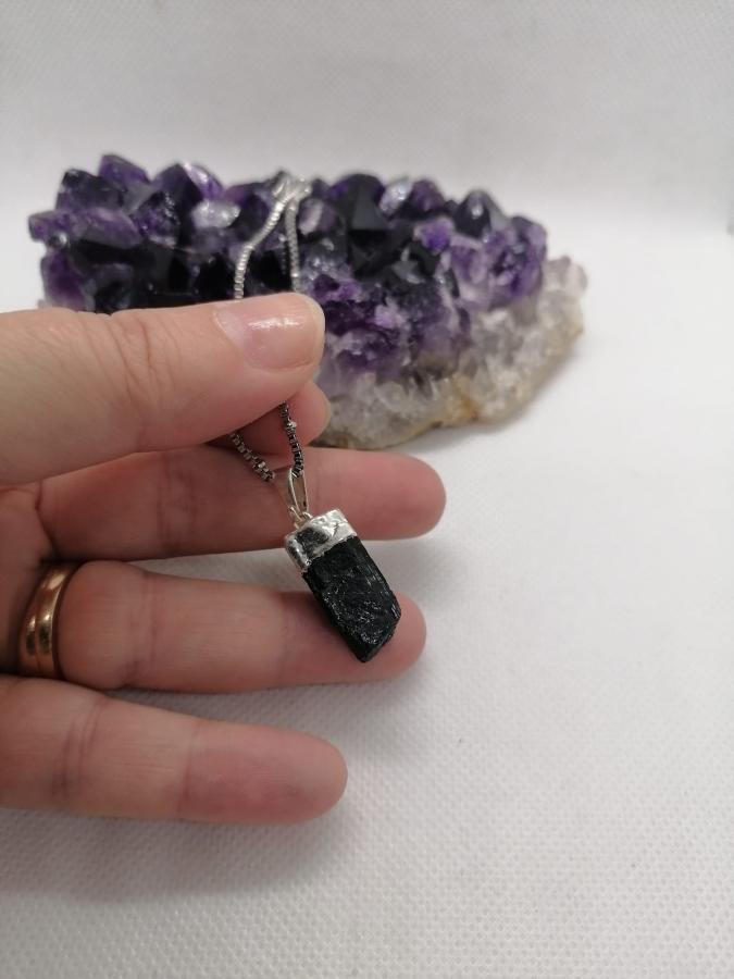 Dije con electro en piedra natural turmalina negra con cadena de gruesa de acero.