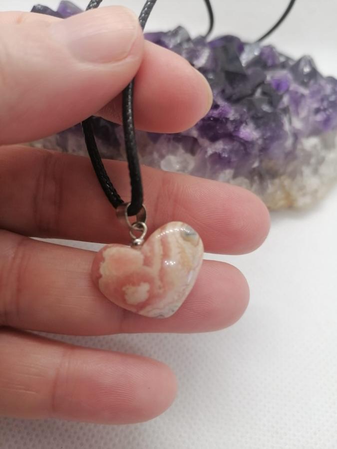 Dije corazón en piedra natural rodocrosita con cordón negro.