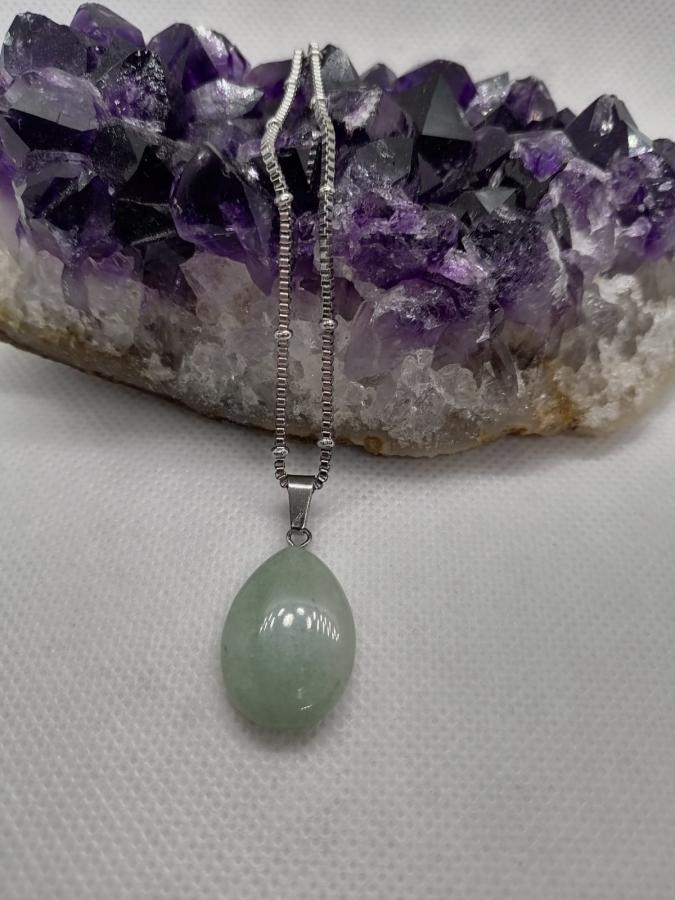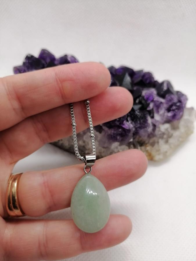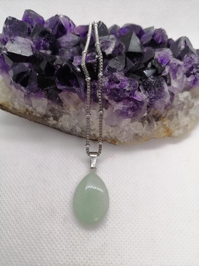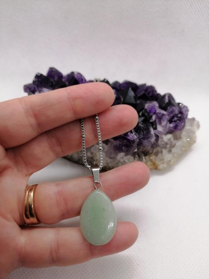 Dije gota en piedra natural cuarzo verde con cadena gruesa de acero.
