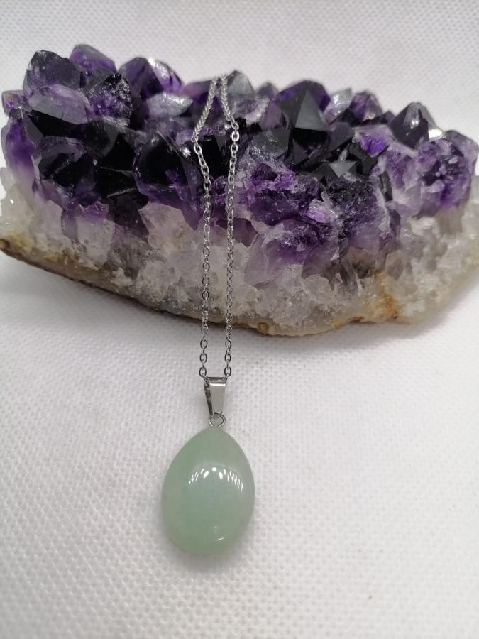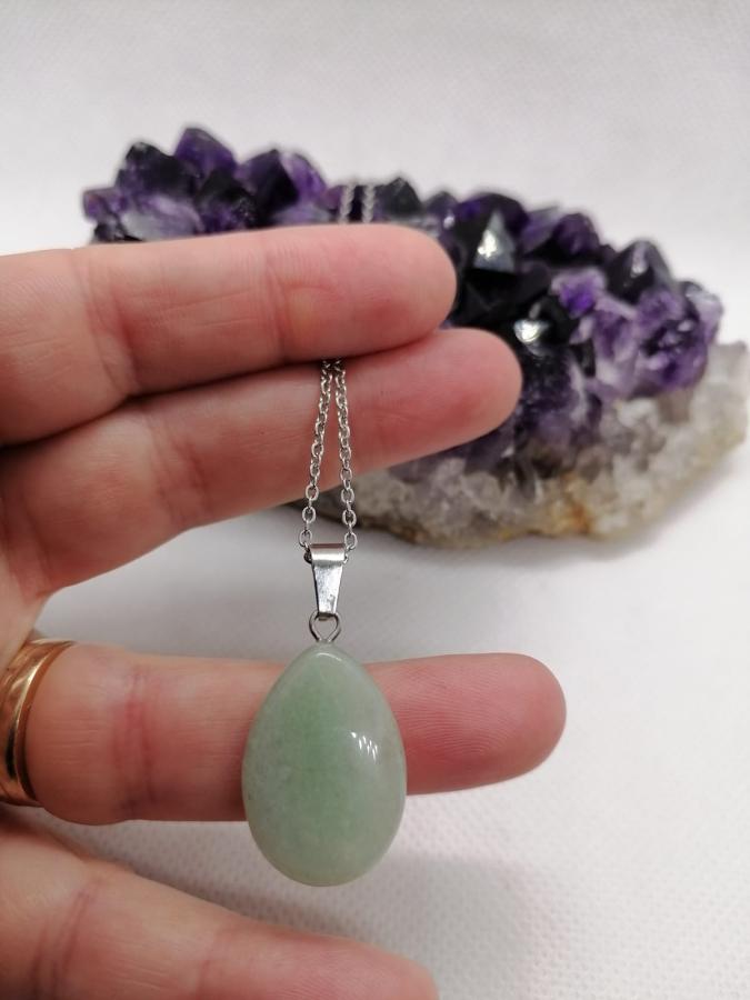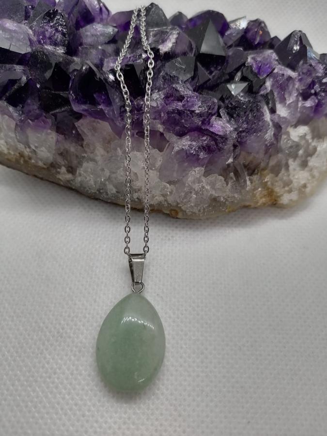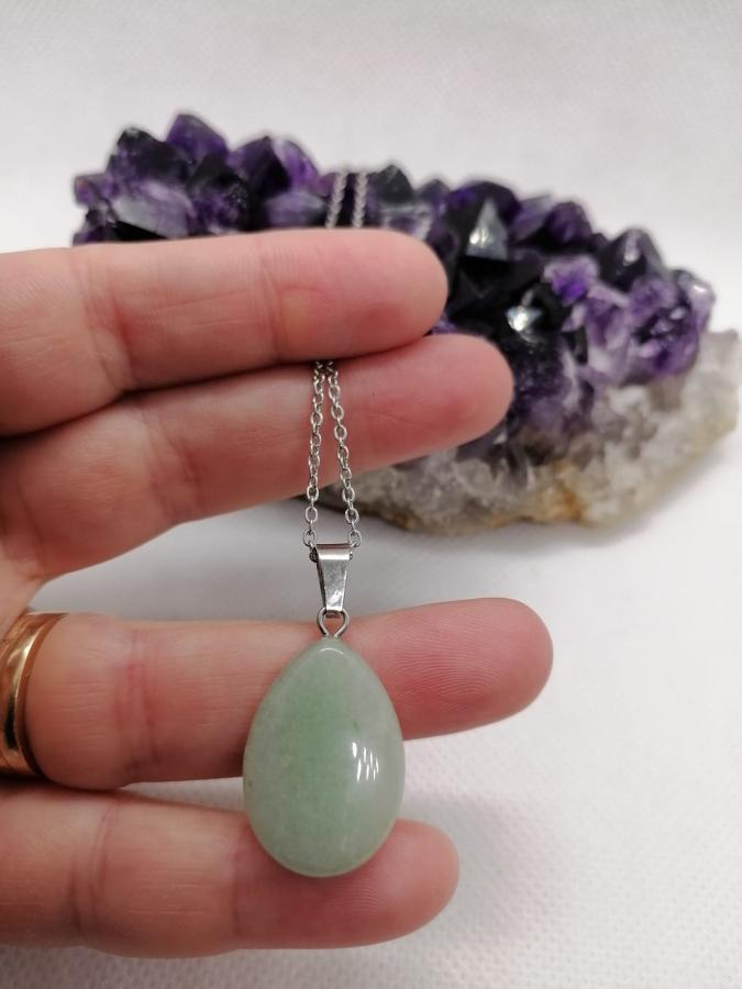 Dije gota en piedra natural cuarzo verde con cadena fina de acero.