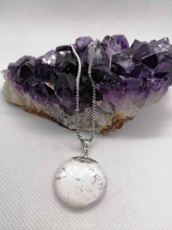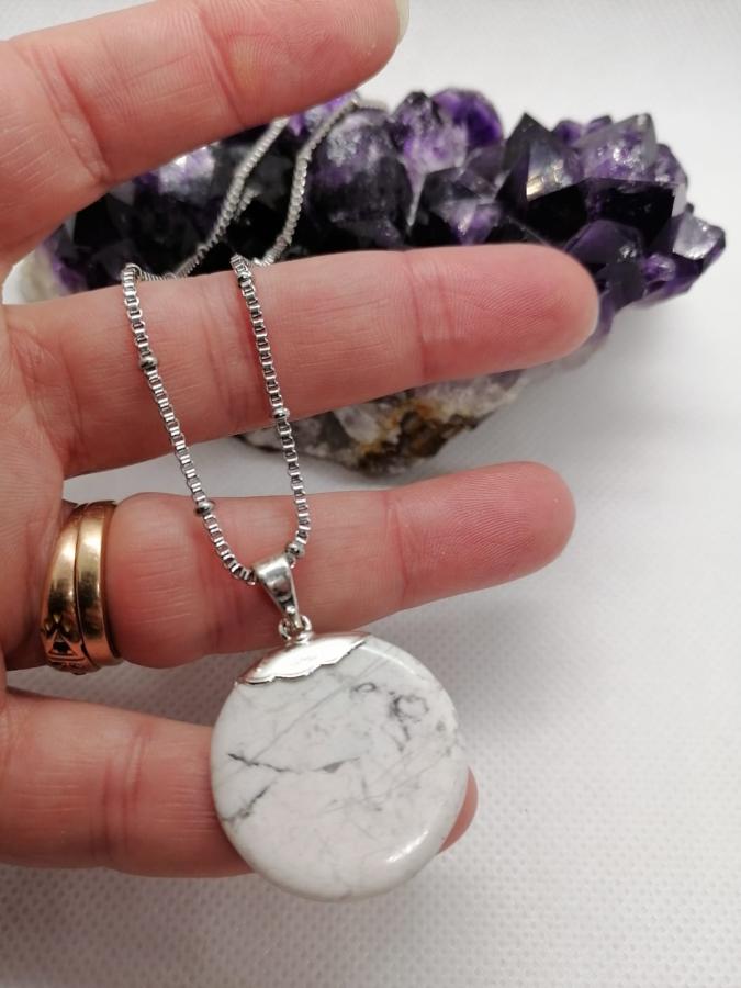 Dije círculo piedra natural Howlita con cadena gruesa de acero.