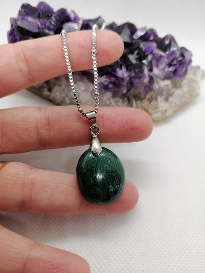 Dije gota ovalada con engarce en piedra natural malaquita con cadena gruesa de acero.