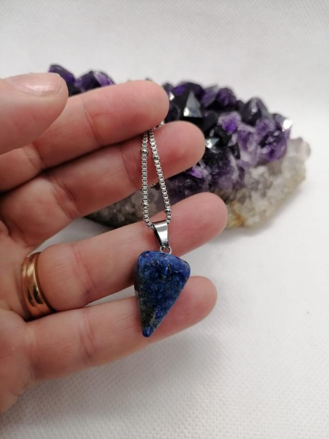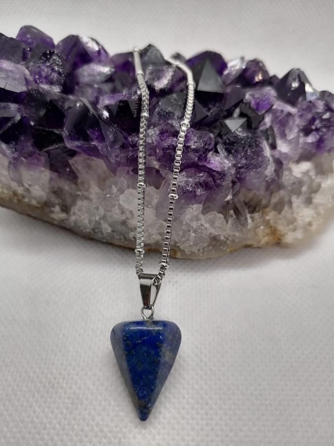 Dije péndulo en piedra natural lapislázuli con cadena gruesa de acero.