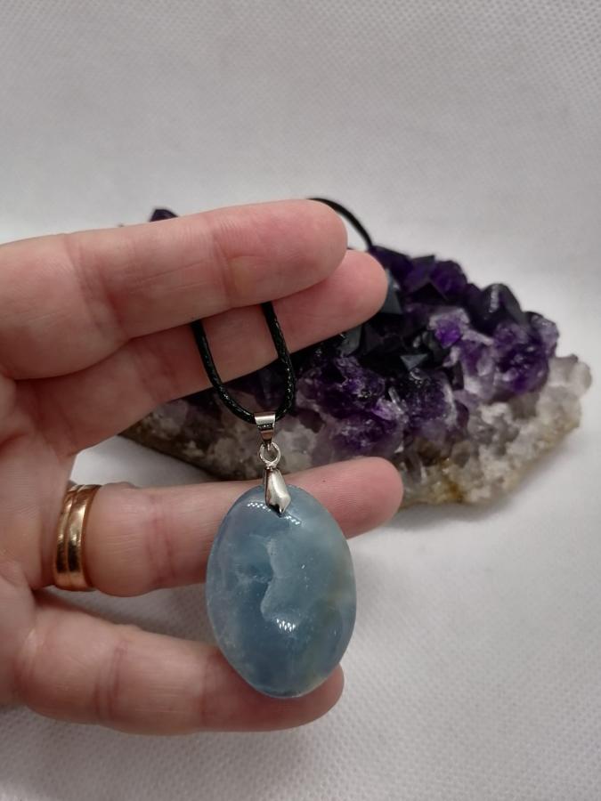 Dije gota ovalada en piedra natural ónix cielo con cordón negro.