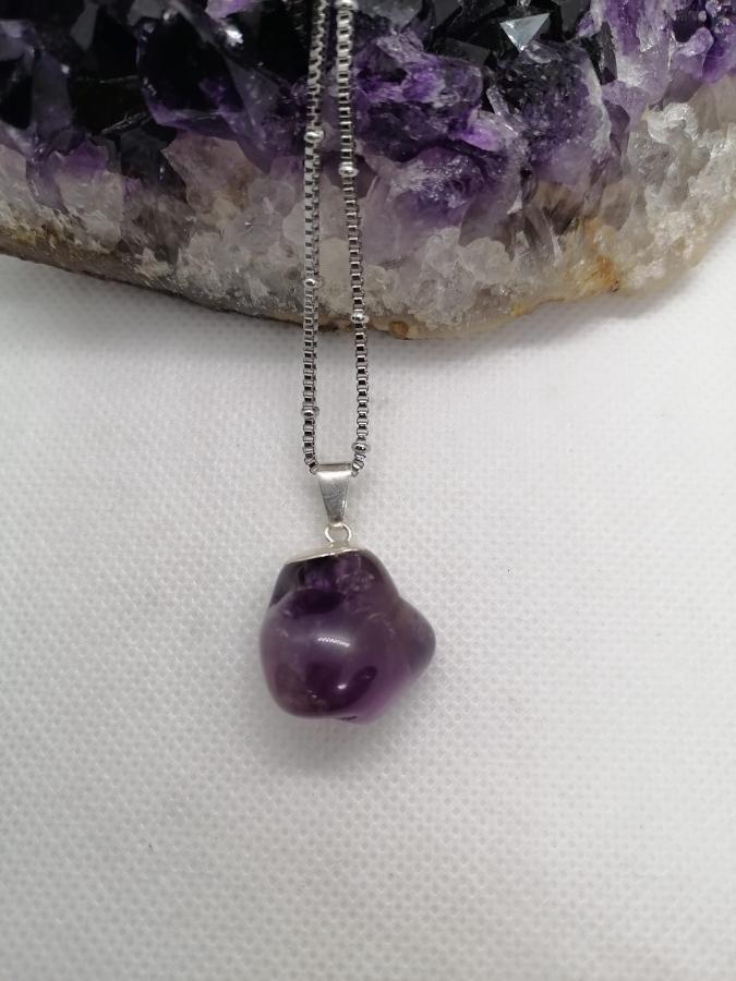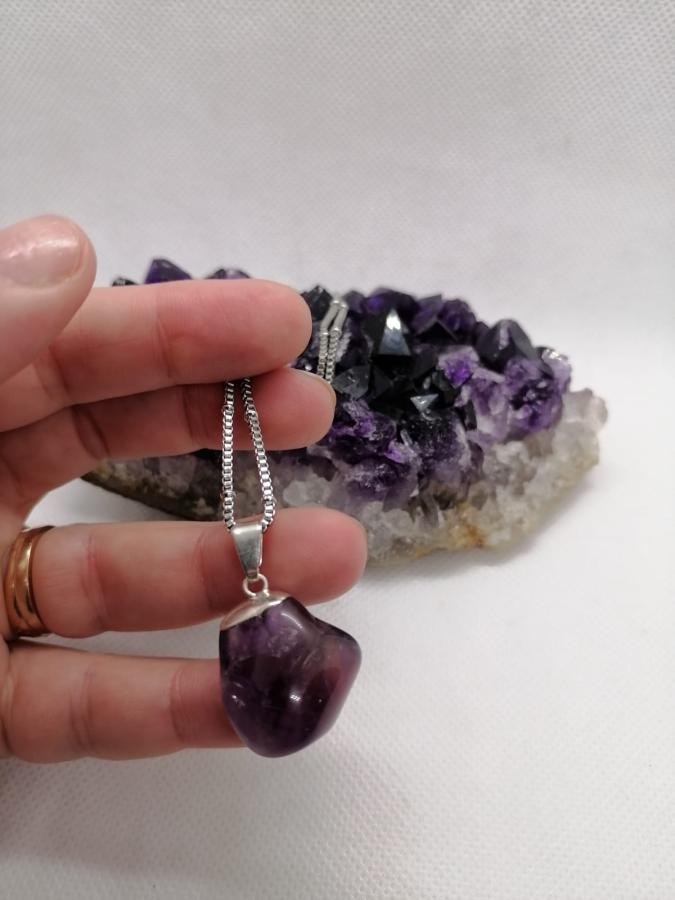 Dije en piedra natural amatista con cadena gruesa de acero.