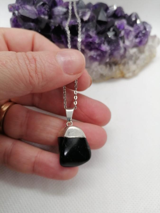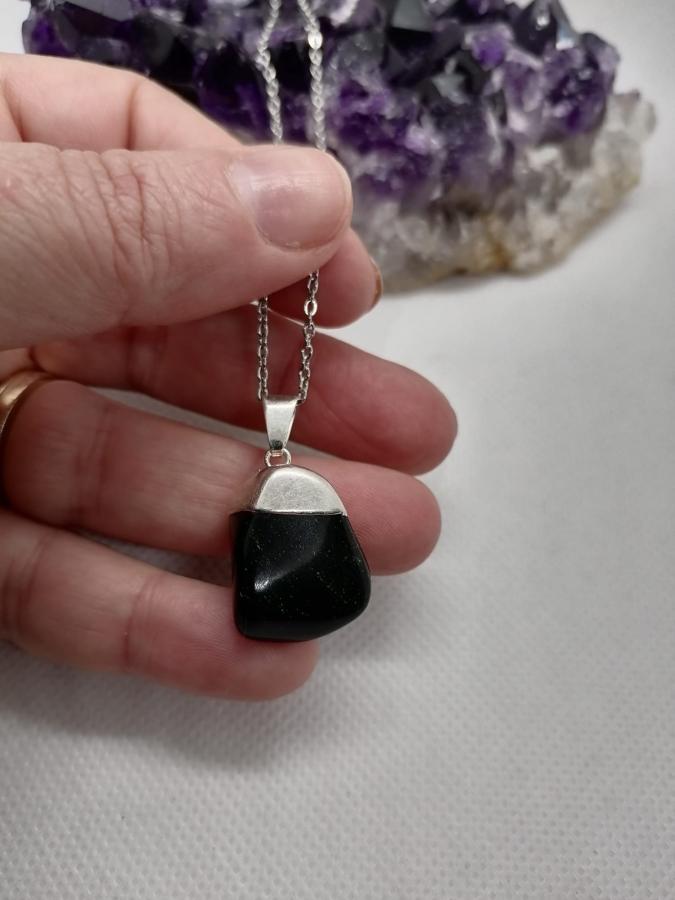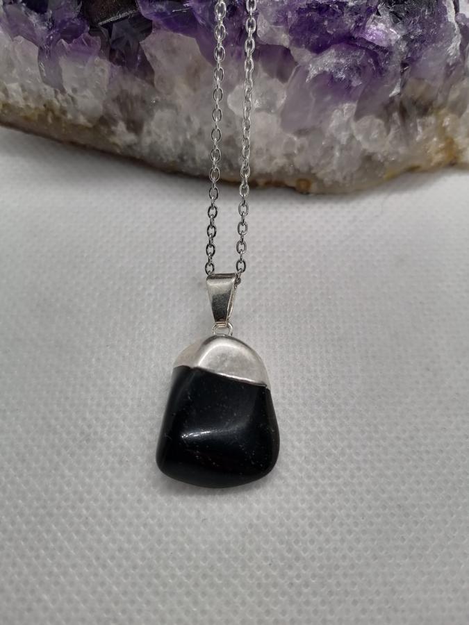 Dije en piedra natural obsidiana con cadena fina de acero.