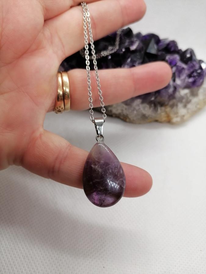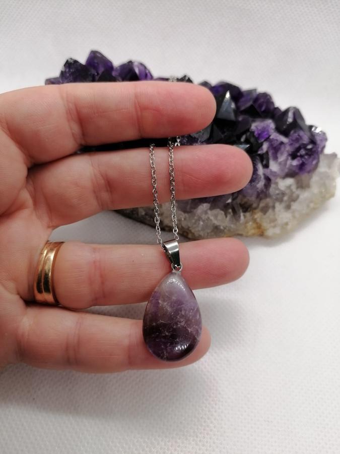 Dije gota en piedra natural amatista con cadena fina de acero.