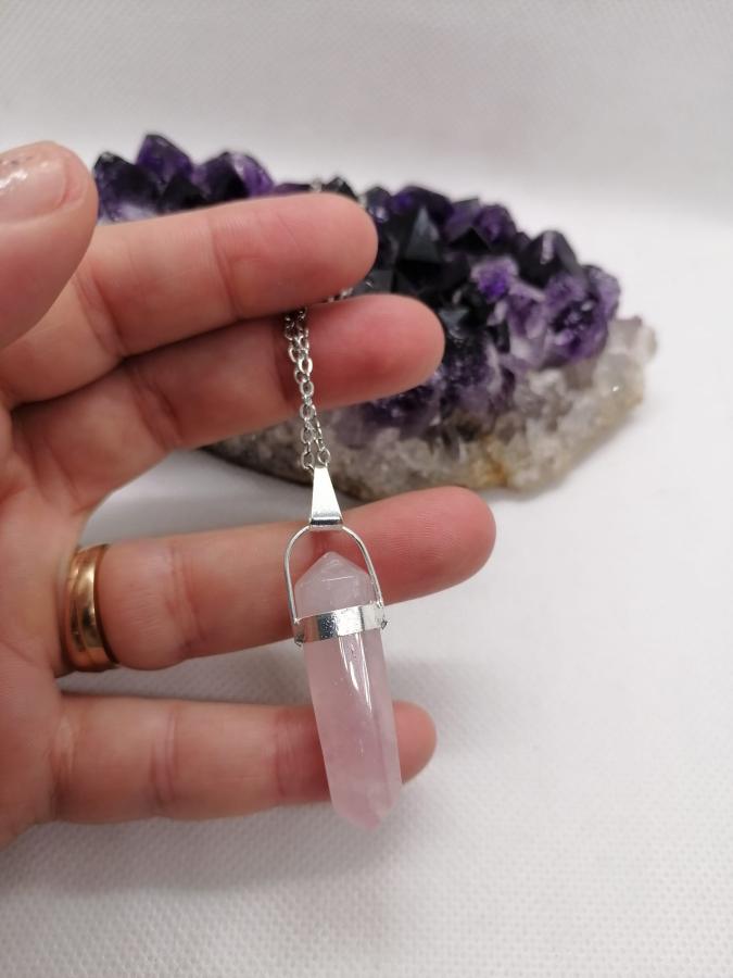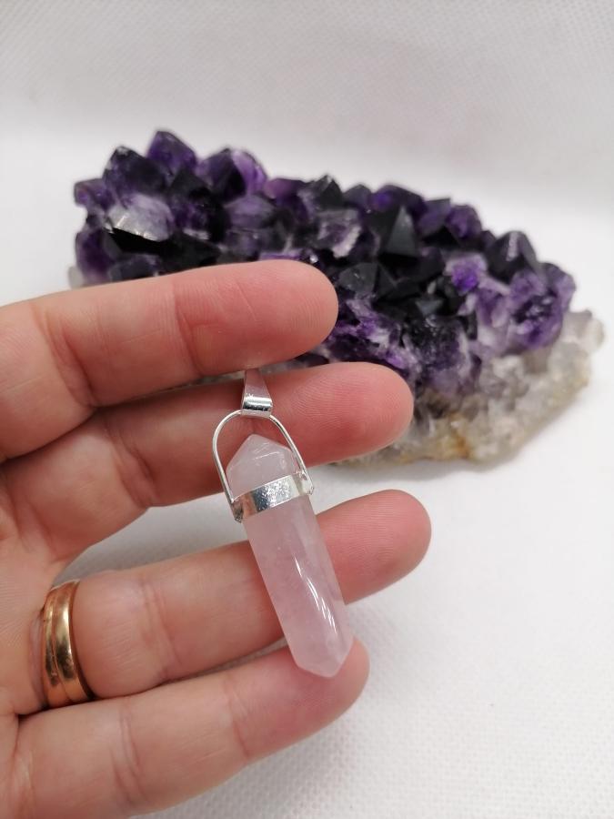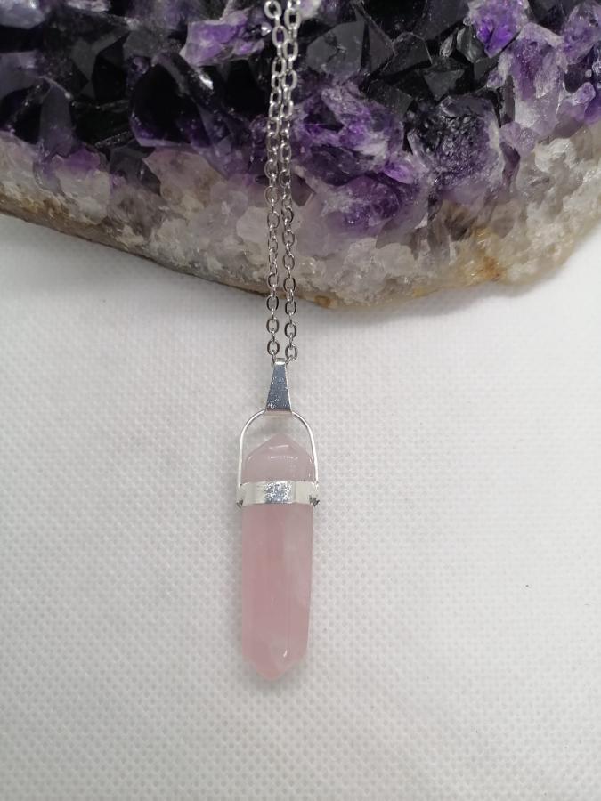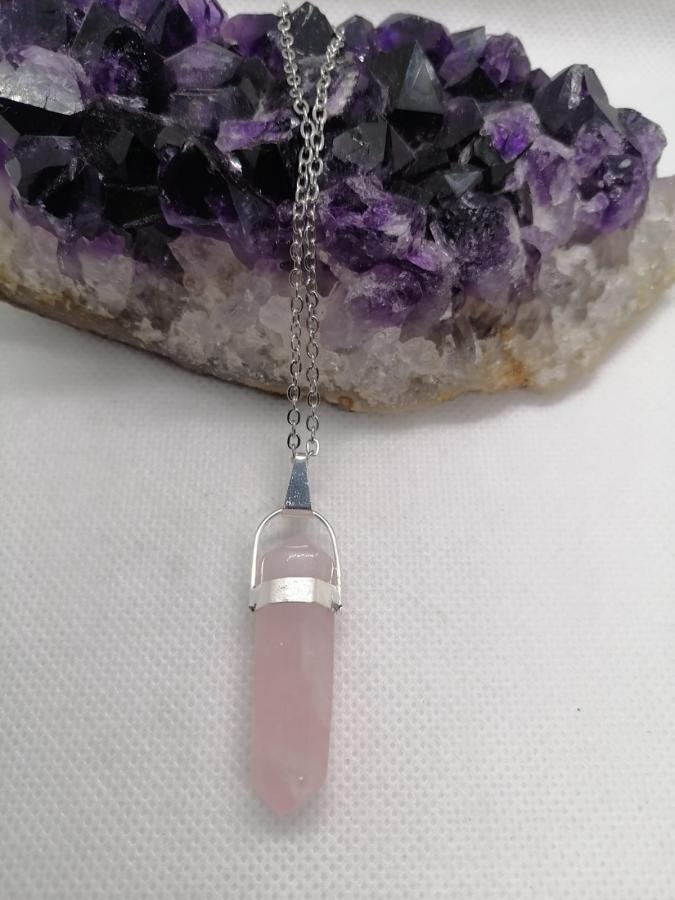 Dije hexágono en cuarzo rosa con cadena fina de acero.
