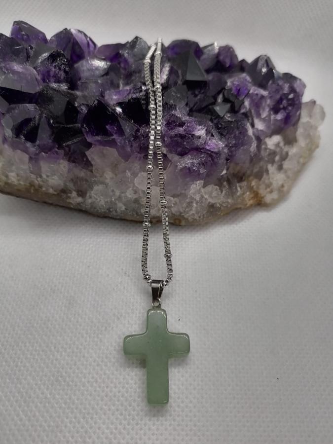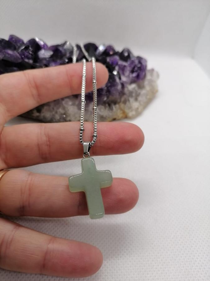 Dije cruz en piedra natural cuarzo verde con cadena gruesa de acero.