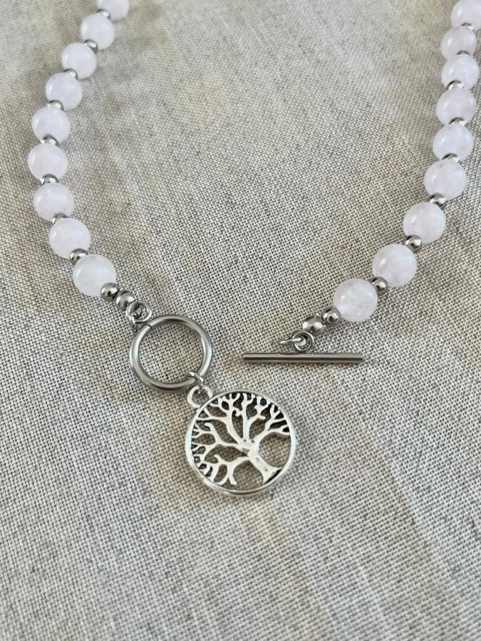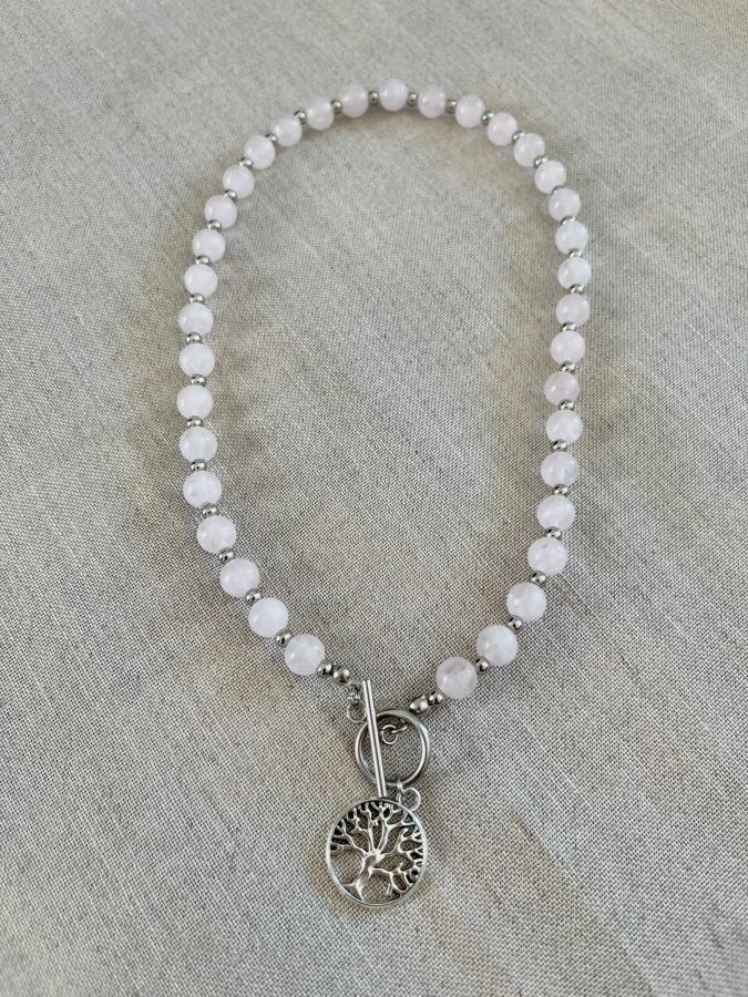 Gargantilla en piedra natural en cuarzo rosa en bolita 8mm.