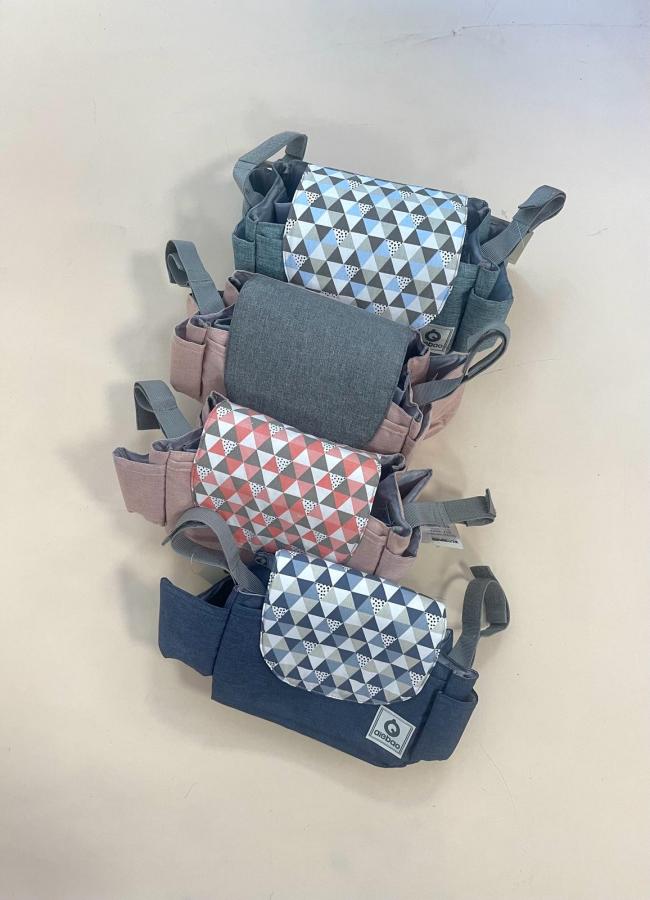 stuche para colgar del coche con tiras de enganche con velcro, dos espacios para mema o botella y espacio de guardado con tapa y compartimiento. Rosado: Rosa viejo con tapa estampada Rosado Viejo: Rosado Viejo con gris Azul Jean: Azul Jean con tapa gris