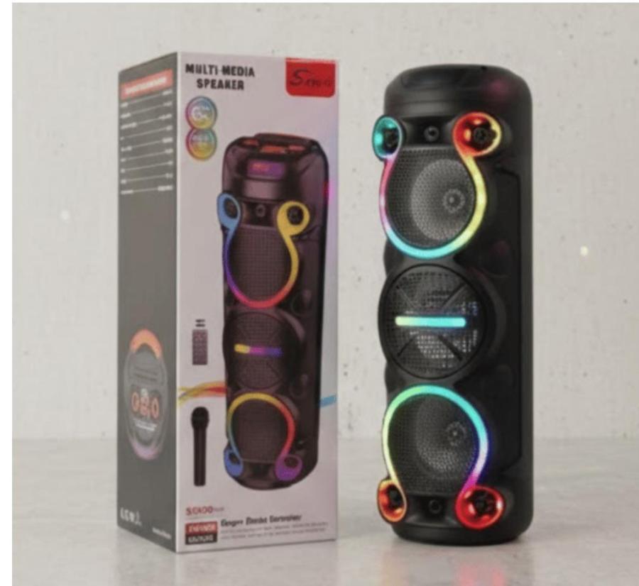 Parlante ZQS6302 portátil con Bluetooth, sonido potente, luces LED, batería recargable y múltiples entradas. Ideal para