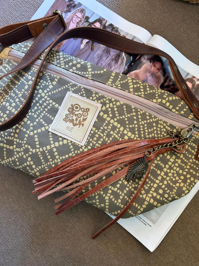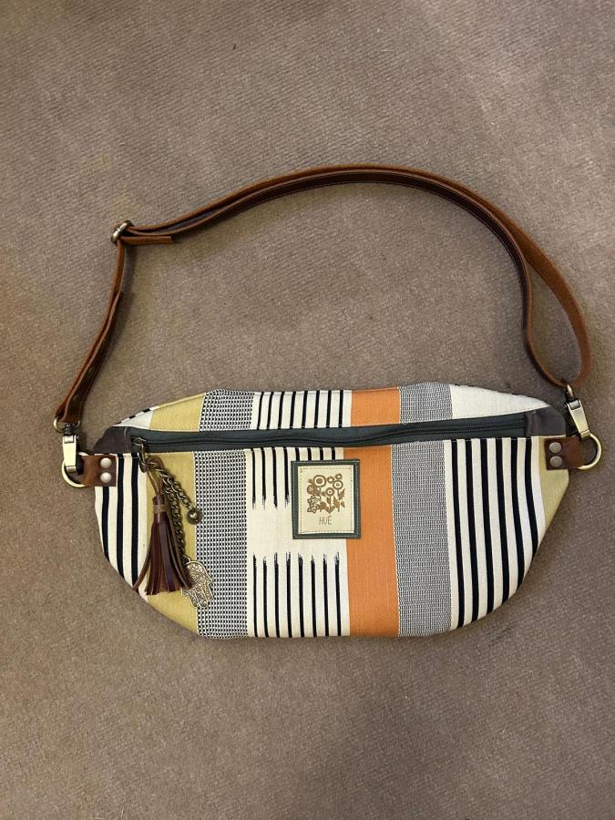 Está confeccionada con telas de excelente calidad, resistentes y con textura, combinadas con correa de cuero natural regulable que permite usarla cruzada o a la cintura. Sus herrajes de bronce le aportan carácter, durabilidad y un detalle artesanal que marca la diferencia.