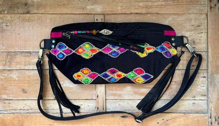 El diseño se destaca por sus flecos, que le dan movimiento y personalidad, y por sus terminaciones cuidadas: cierre seguro, detalles en cuero y un accesorio colgante que suma estilo. Cada Chichen es única, ya que se producen muy pocas unidades por diseño de tela, haciendo de esta riñonera una pieza verdaderamente exclusiva.