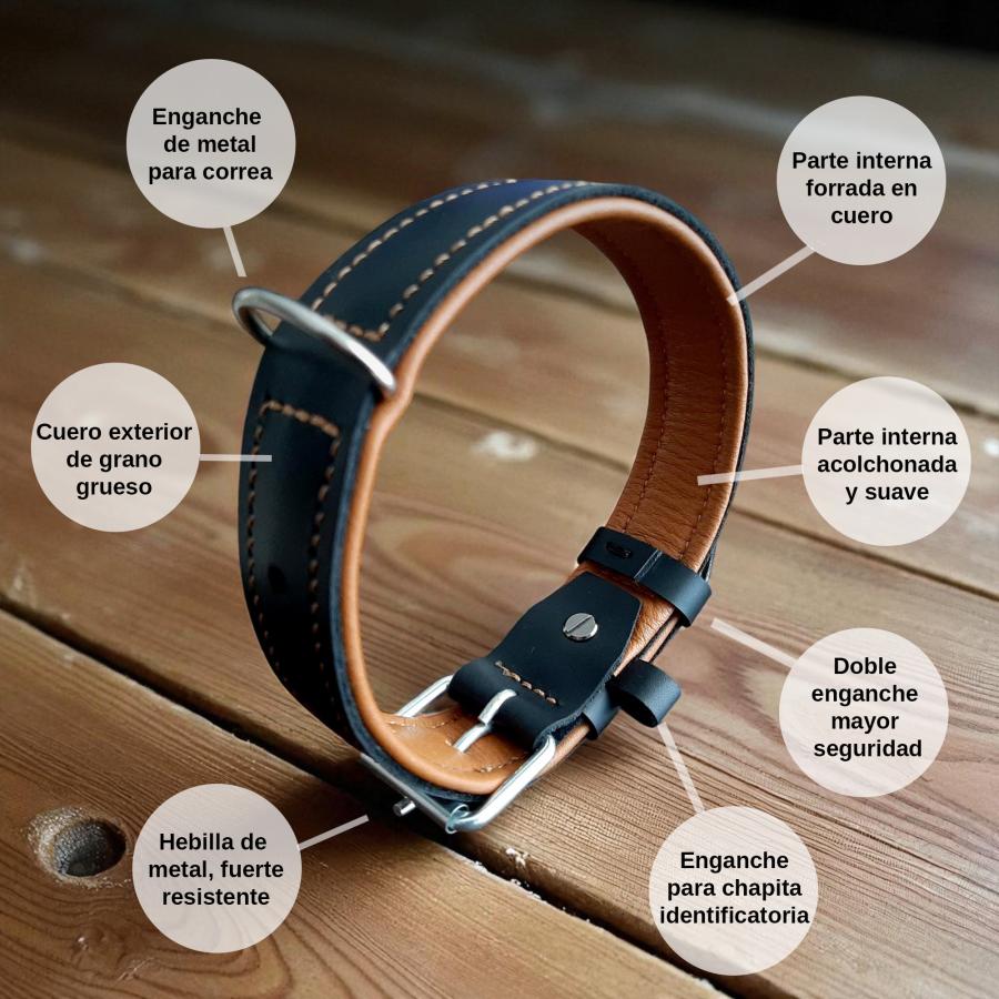 Cada collar está cosido a mano, con un interior acolchonado y suave que protege el cuello de tu perro para un ajuste cómodo