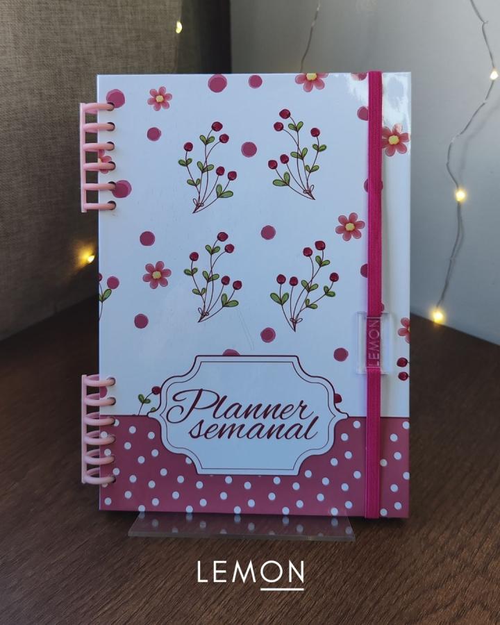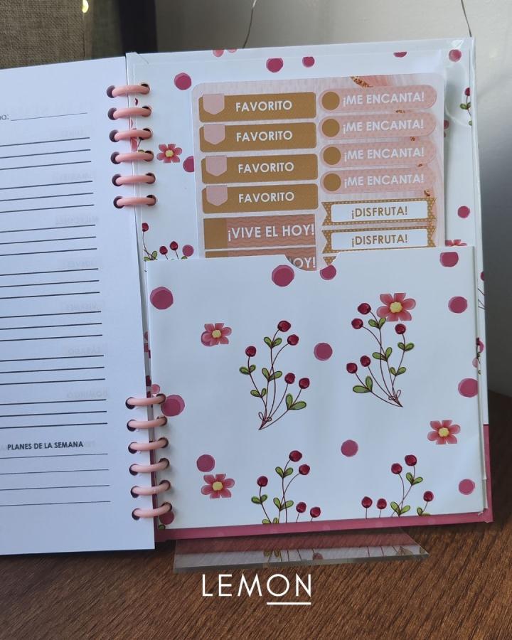 Planner modelo Cherry con sistema de rulo clic, que permite agregar nuevas hojas cuando las anteriores se terminan. Incluye hoja de datos, páginas personalizadas, sobre interno para guardar notas importantes, cierre con elástico para mayor comodidad y stickers para acompañar la organización de tu día a día.