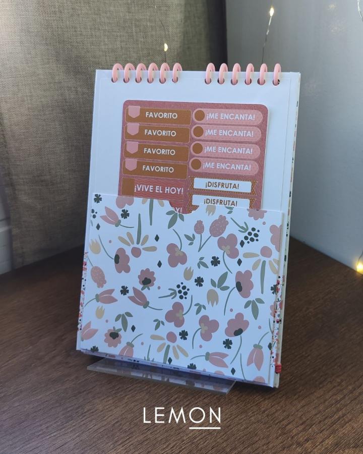 Planner modelo Spring con sistema de rulo clic, que permite agregar nuevas hojas cuando las anteriores se terminan. Incluye hoja de datos, páginas personalizadas, sobre interno para guardar notas importantes, cierre con elástico para mayor comodidad y stickers para acompañar la organización de tu día a día.