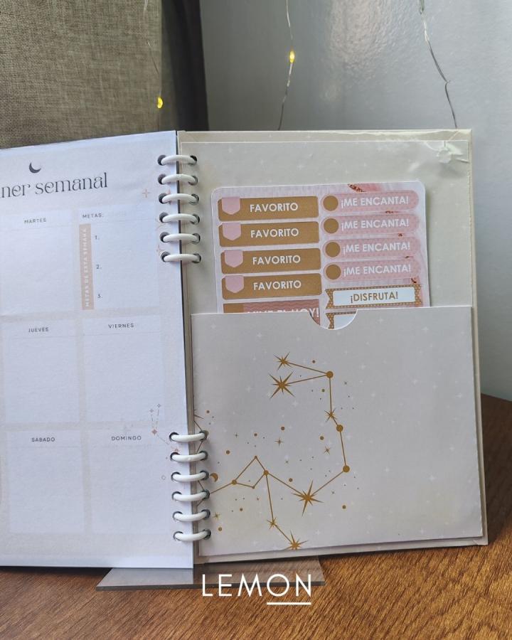 Con sistema de rulo clic, que permite agregar nuevas hojas cuando las anteriores se terminan. Incluye hoja de datos, páginas personalizadas, sobre interno para guardar notas importantes, cierre con elástico para mayor comodidad y stickers para acompañar la organización de tu día a día.