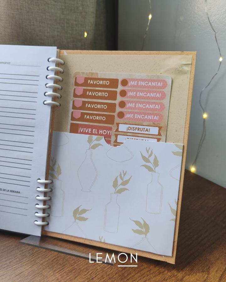 Con sistema de rulo clic, que permite agregar nuevas hojas cuando las anteriores se terminan. Incluye hoja de datos, páginas personalizadas, sobre interno para guardar notas importantes, cierre con elástico para mayor comodidad y stickers para acompañar la organización de tu día a día.
