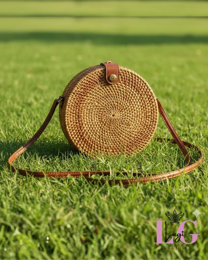 Hecho artesanalmente con fibras naturales tejidas a mano, combina la frescura con el toque sofisticado de su correa de cuero marrón, creando un diseño único, liviano y lleno de personalidad.
