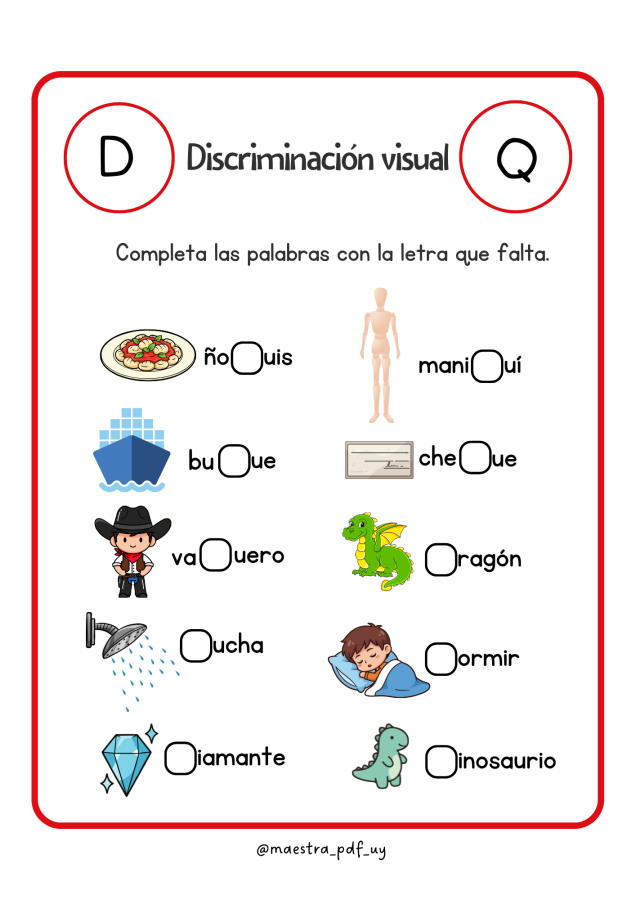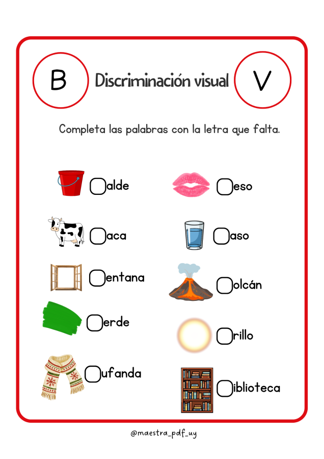 🟠Discriminación Visual es un libro educativo pensado para niños y niñas que están dando sus primeros pasos en la lectura y la escritura. A través de actividades simples y entretenidas, los pequeños deben identificar palabras y descubrir cuál es la letra correcta que falta, fortaleciendo su atención y percepción visual.