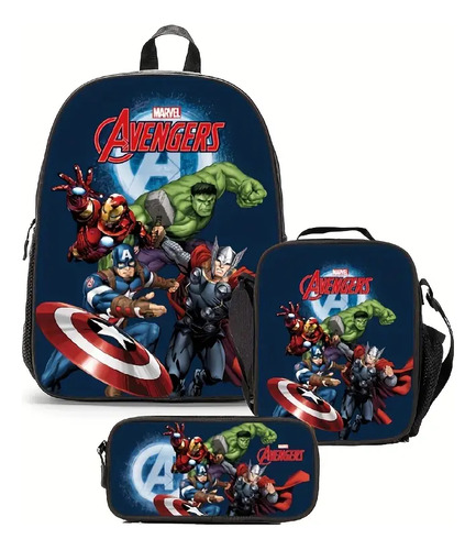 La Mochila Escolar Avengers 15L con Lunchera y Cartuchera Negro es el set perfecto para los fanáticos de los superhéroes de Marvel.