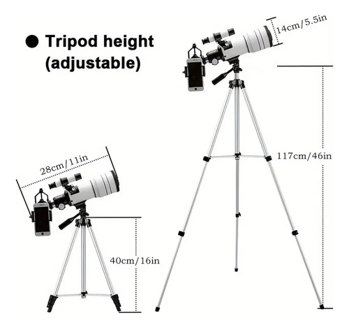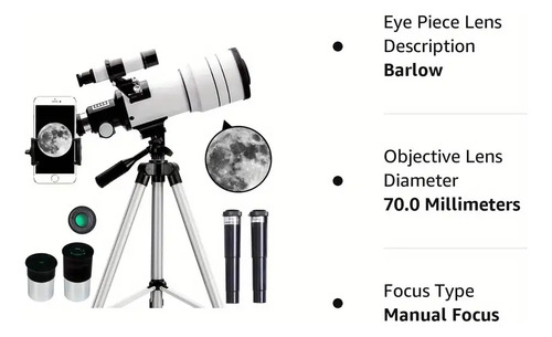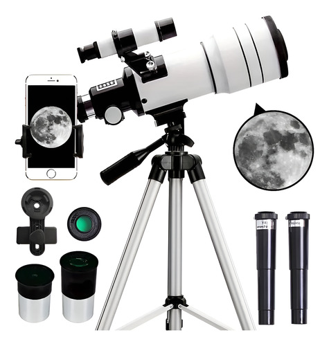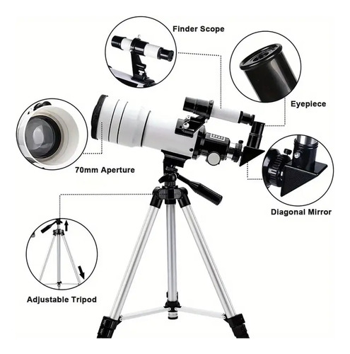 Descubrí el universo con el telescopio refractor F30070m 🔭🌙. Su diseño en blanco elegante y funcional es perfecto para principiantes y aficionados a la astronomía, permitiendo observar estrellas, planetas y la luna con claridad ✨.