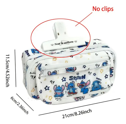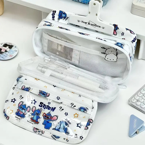 Cartuchera Stitch Diseño Práctico 3 Compartimientos Blanco Stitch Celestes