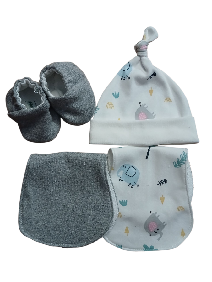 Este set cuenta con gorrito de algodón, babitas y zapatitos todo en algodón para la delicada piel del recién nacido
