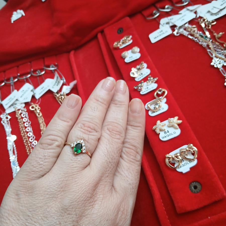 Anillocon baño de oro de 18 kilates ,elaborado con exelente terminacion y acabado brillante .Presenta una piedra verde central que aporta un toque de elegancia y sifisticasion.Diseño versatil,ideal para realzar cualquier look, tanto para uso diario como para ocaciones especiales.Pieza disponible en stock limitado.Producto con garantia por 2 años.