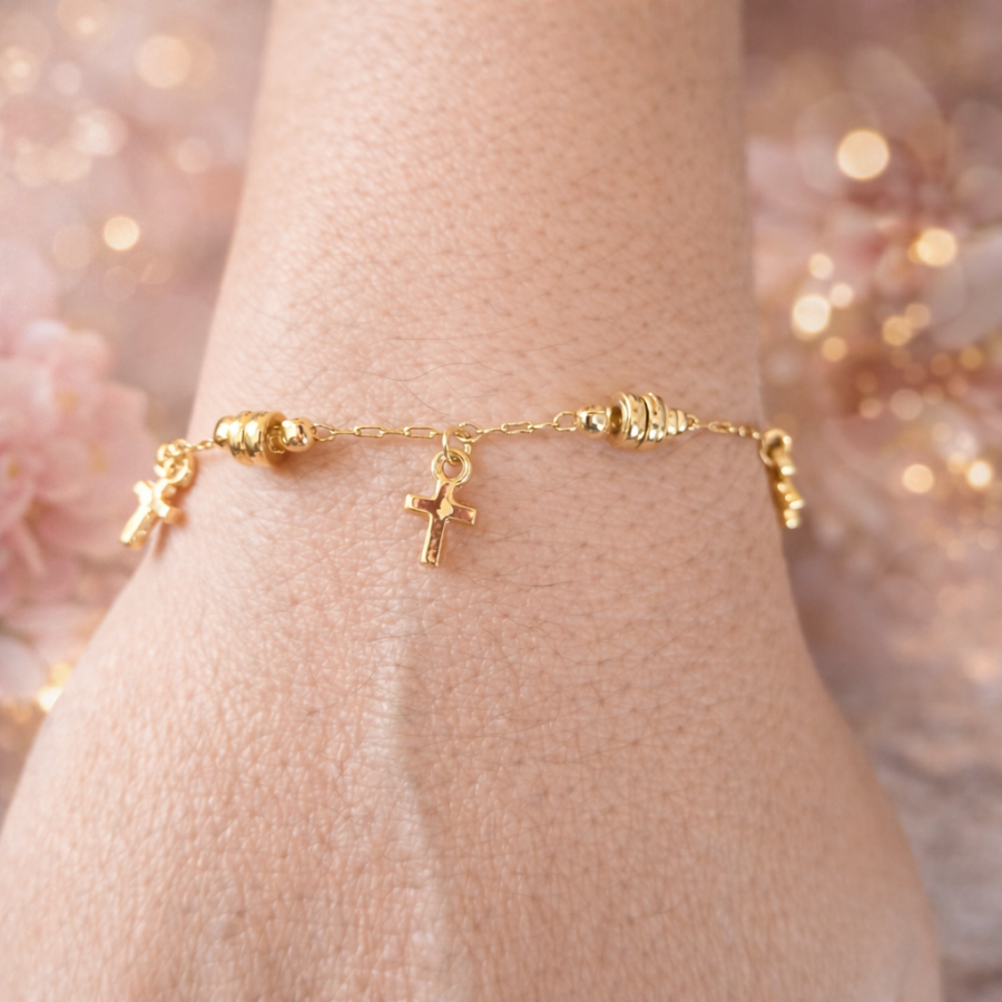 Manilla con baño de oro 18k ,con cadena fina ,detalles decorativos y un pequeño dije de cruz central.Diseño delicado,ideal para regalar o llevar todos los dias .