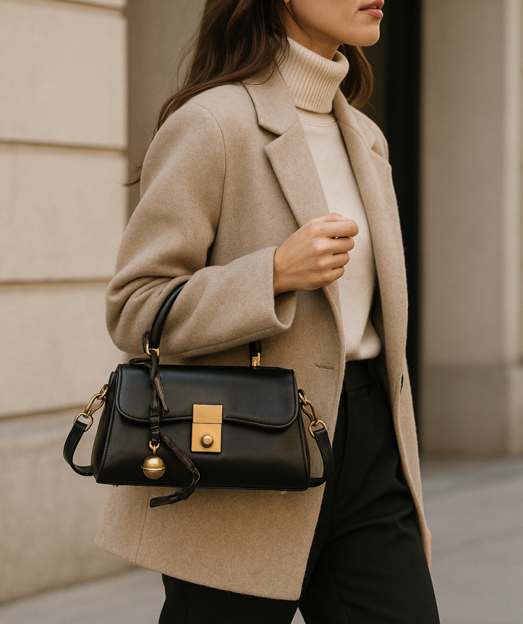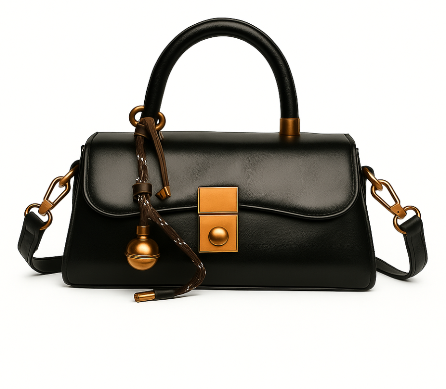 El bolso Noir Éclat resalta por su estructura definida, acabados impecables y herrajes dorados que aportan un brillo sutil y poderoso.