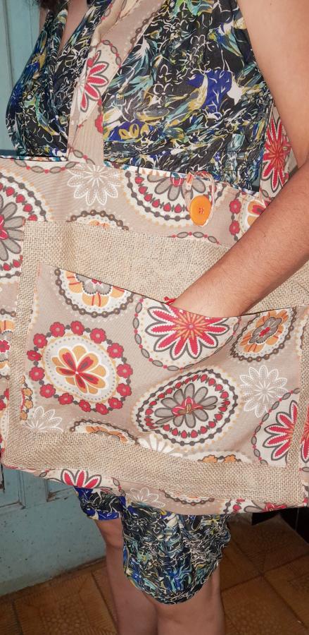 Bolsos combinados en lona de algodón y arpillera , forrados, con bolsillos en ambas caras externas y también en el forro , tamaño ideal