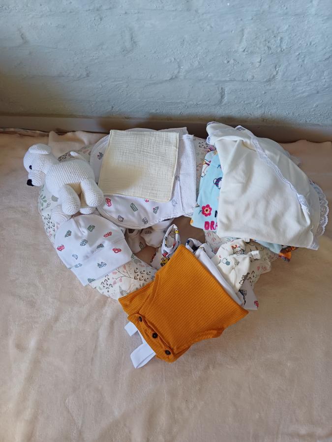No puede faltar en el bolso; 2 peleles 2 enteritos 3 toallitas 1gorra 2 par de zapatitos 3 pares de medias 1toalla de baño con capucha 1 sabanita con capucha 1 body 1 almohada para amamantar y 1 amigurumi de apego.