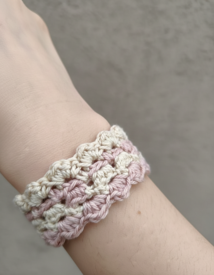 Pulsera fina y delicada, tejida completamente a mano en hilo fino, en tonos suaves y con un pequeño relieve que aporta textura sin recargar.