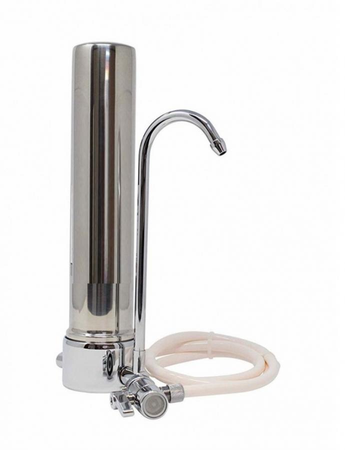 El purificador de agua sobre mesada INOX está fabricado en Acero Inoxidable 304. Utiliza un filtro de cerámica y carbón activado en bloque en su interior.