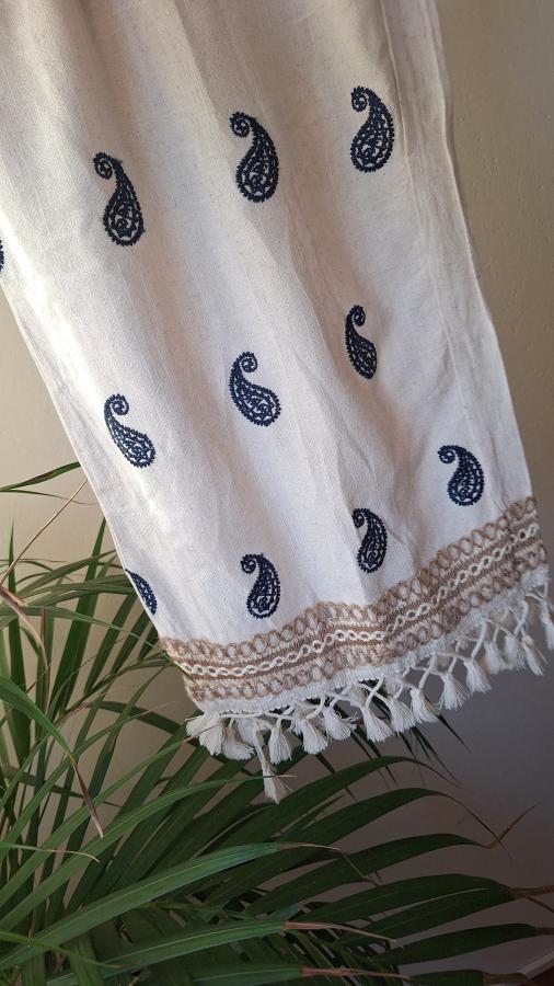Pantalón largo de algodón blend efecto lino, con bordados en hilo azul y terminación con flecos en botamanga.