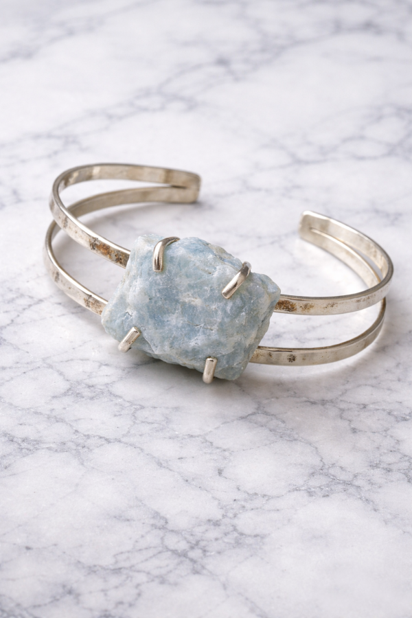 Pulsera rígida de alpaca repujada con engarce de calcita azul en bruto.