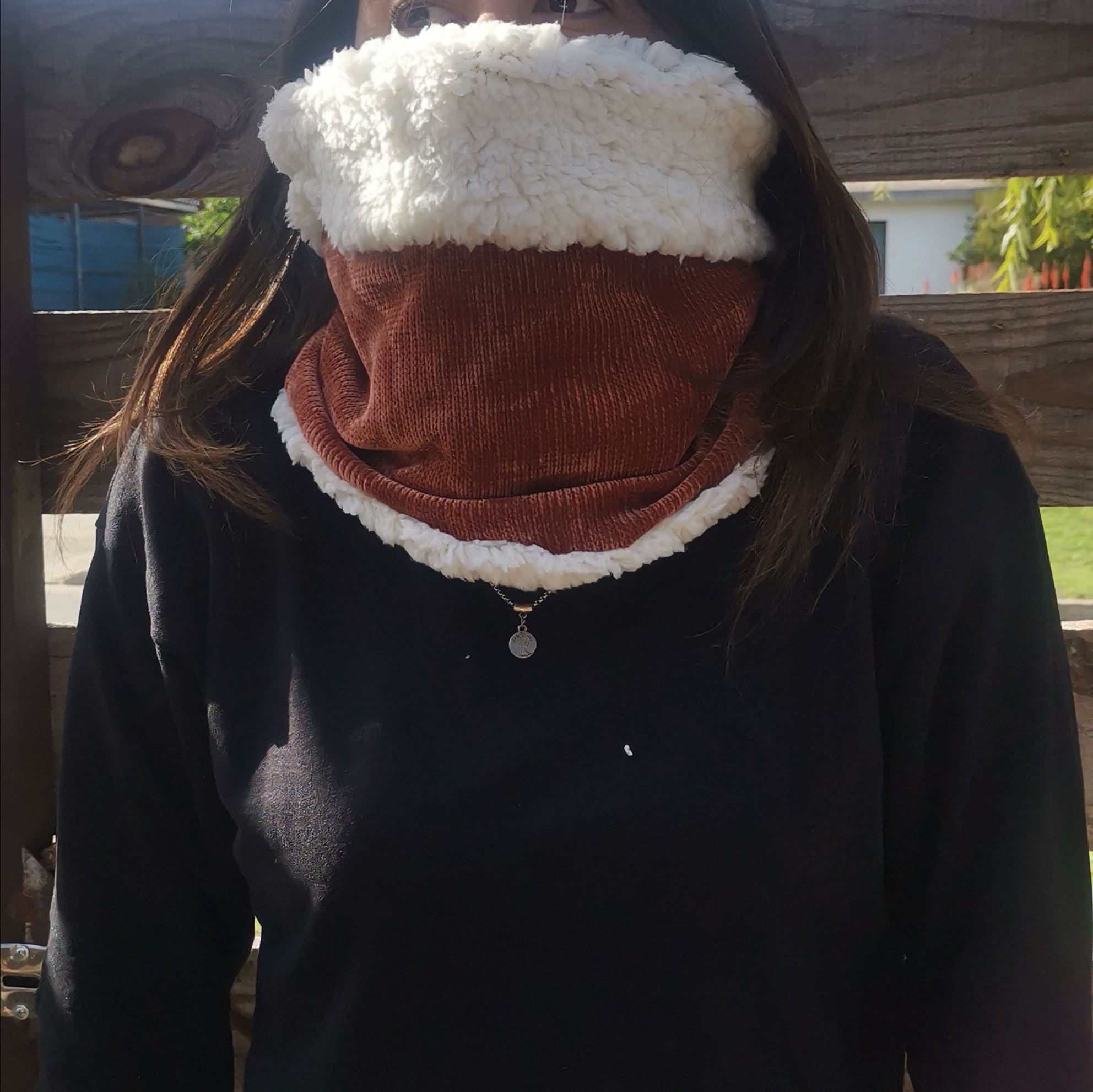 Cuello confeccionando en chenille terracota y sherpa simple color crudo.