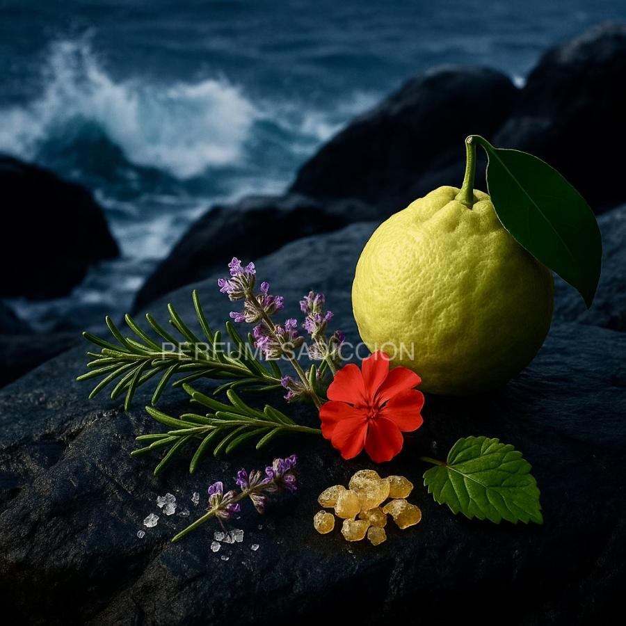 Sus notas de salida combinan bergamota, jengibre y la intensidad de las notas marinas; su corazón fusiona geranio bourbon, esencia de romero y salvia esclarea; y un fondo de maderas vibrantes, esencia de pachulí e incienso crea una sensación de misterio.