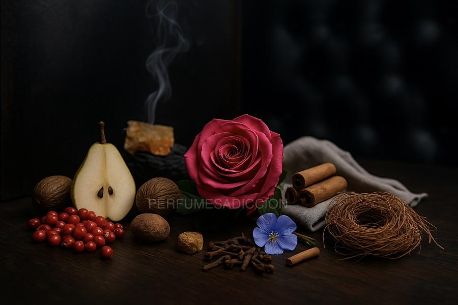 Un floral masculino inesperado: picante, sensual y sofisticado, donde la rosa se vuelve oscura y elegante entre maderas cálidas y un toque especiado provocador.