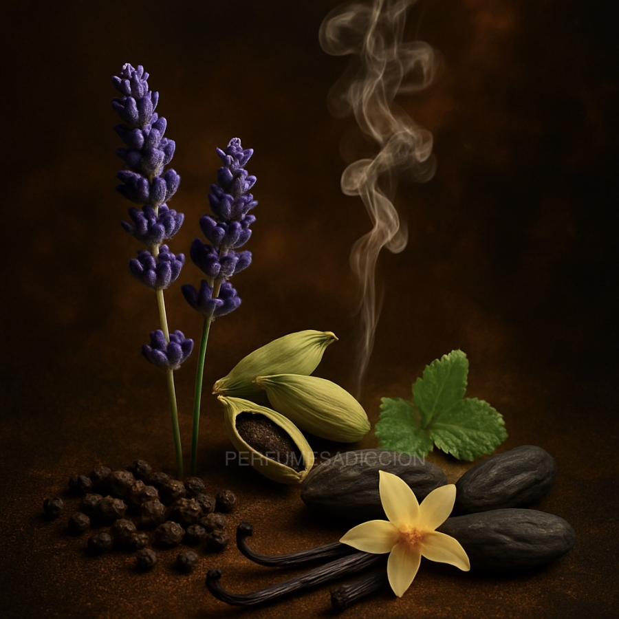 Dulce oscuro y especiado que domina la noche: un contraste intenso entre lavanda aromática, vainilla cálida e incienso profundo. Poder que seduce con fuerza.