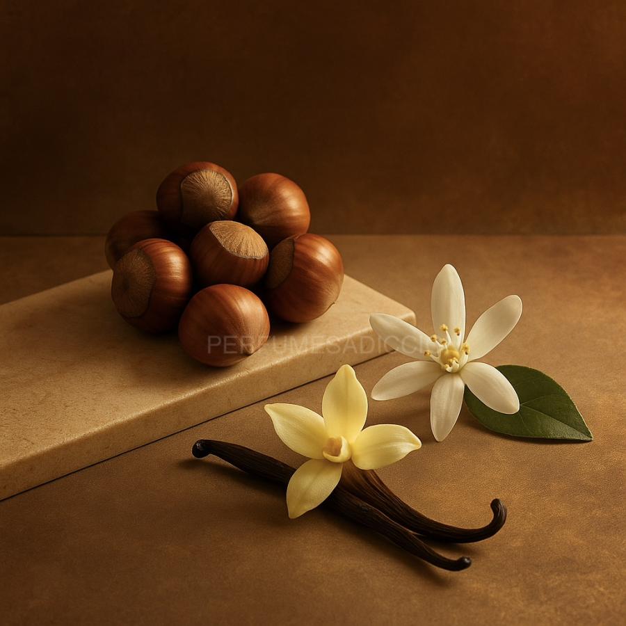 Un abrazo gourmand elegante: avellana tostada, flor de azahar y vainilla cálida en una estela cremosa y sensual.